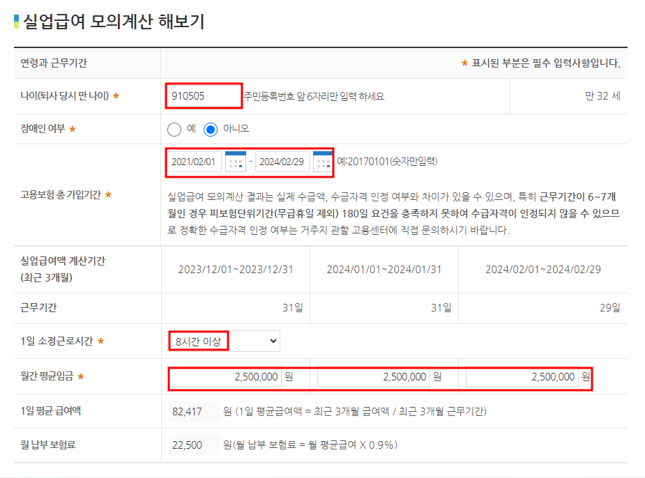 저는 상세 모의계산으로 저희가 가정해 본 것처럼 만 32세, 36개월 근무, 8시간 이상, 평균임금 250만원으로 적용해 보았습니다. 결과는 같게 나오네요.