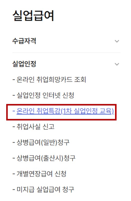 6. 해당 교육은 수급자격 신청을 위한 사전 교육입니다. 실제로 실업인정을 받기 위해서는 온라인 취업특강(1차 실업인정 포함) 교육을 받아야 합니다. 실업인정 인터넷 신청 메뉴의 두 번째 페이지인 재취업 활동단계에서 '동영상 바로가기' 또는 '온라인취업특강 바로가기' 버튼을 이용해서 수강하셔야 합니다.