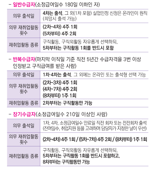 또한, 장기수급자(소정급여일수 210일 이상)는 수급기간 만료 직전 실업인정회차(마지막에서 2번째) 실업인정일에 추가로 고용센터에 출석하여 실업인정 신청 및 재취업지원 상담을 진행해야 합니다.
