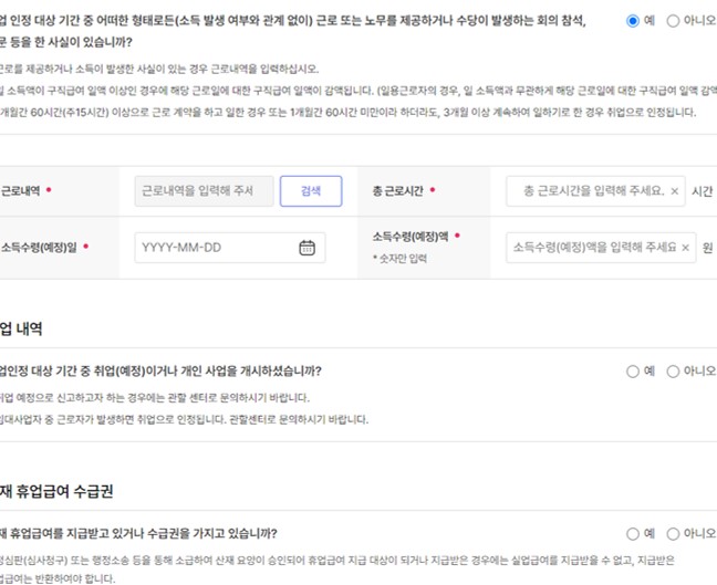 6. 근로 제공, 취업 내역, 산재휴업급여 수급권에 대한 해당사항 체크