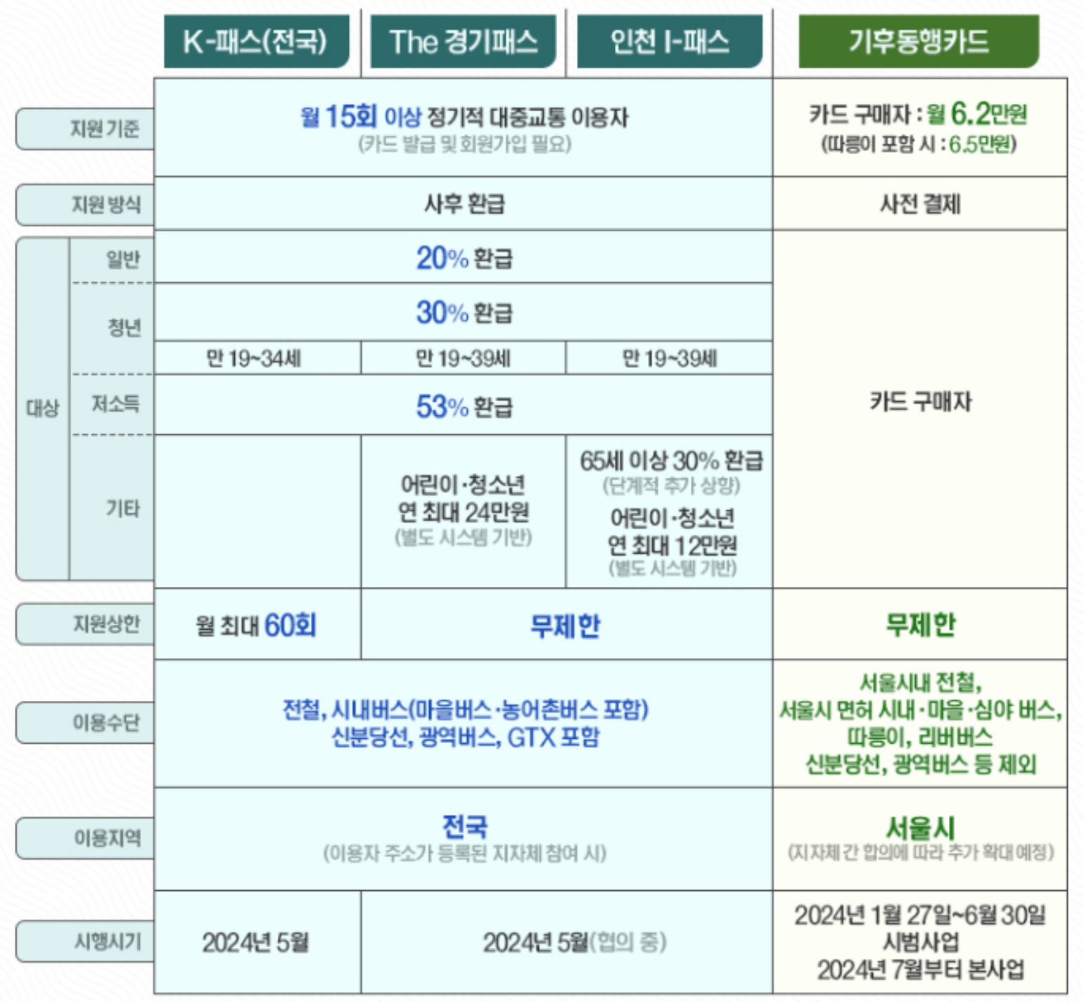 K패스와 마찬가지로 일반인 20%, 청년층 30%, 저소득층 53% 환급률이 적용되지만, 청년층의 나이가 만 19세에서 39세로 청년층 범위가 넓어졌습니다.