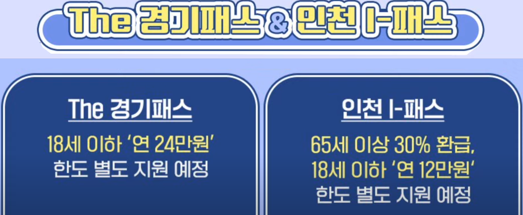 그리고 경기도는 청소년 교통비 지원사업이 따로 있어서 18세 이하 청소년들에게는 연 24만 원 한도로 별도 지원되고, 인천아이패스는 65세 이상은 30% 환급, 18세 이하는 연 12만 원 한도로 별도 지원 예정입니다.