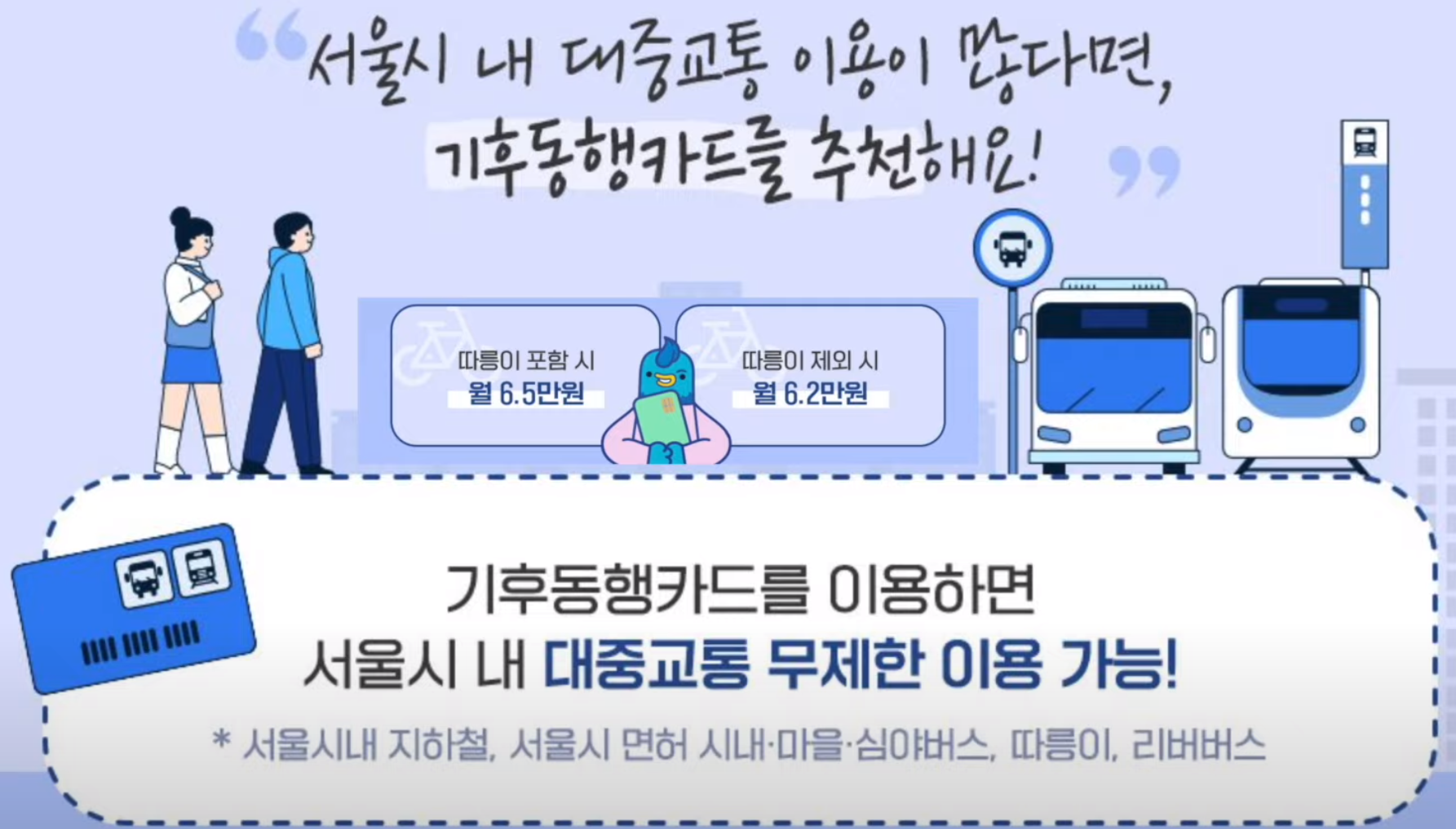 서울 기후동행카드는 일정 금액을 지불하면 지하철, 버스 등 서울시내 대중교통과 공 자전거인 따릉이까지 무제한으로 이용할 수 있다고 합니다.