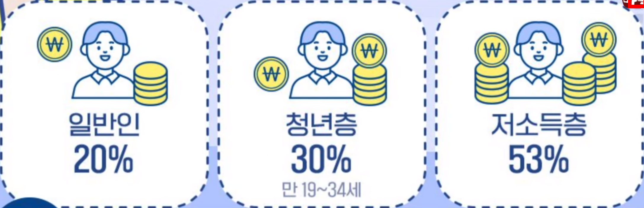 이때 일반인은 20%, 청년층은 30%, 저소득층은 53% 까지 환급받을 수 있는데요. 금액으로 보면 일반인 14,000원, 청년 21,000원, 저소득층은 37,000원 까지 환급받을 수 있습니다.